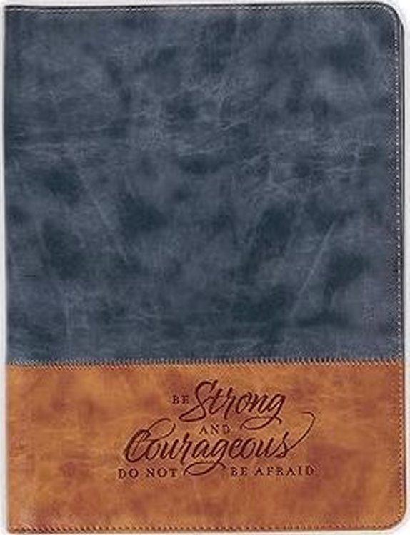 The Strong and Courageous Butterscotch and Navy Faux Leather Padfolio is part of the Strong and Courageous Butterscotch and Navy Collection and is designed to encourage pastors, leaders, and mentors. This collection also includes a faux leather luggage tag, a faux leather checkbook wallet, a faux leather bookmark, a ceramic coffee mug, a stainless steel travel tumbler, and a faux leather Bible cover.