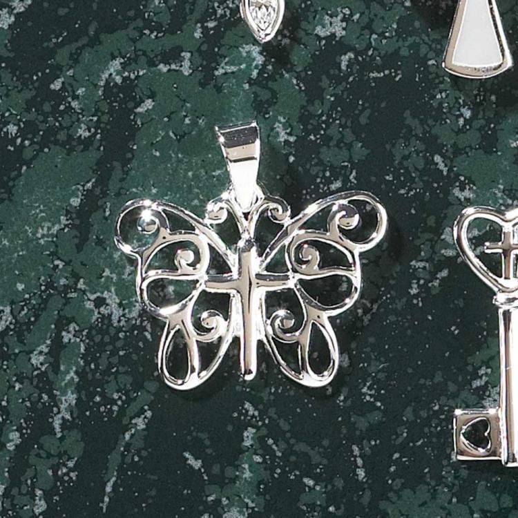 Exquisite butterfly pendant is designed with a cross at the center, reminding us that a life with Christ at its center is a new creation – much like a butterfly! Silver plated pendant is about 3/4″” wide and 1/2″” long. Chain is 18″”. In deluxe gift box.