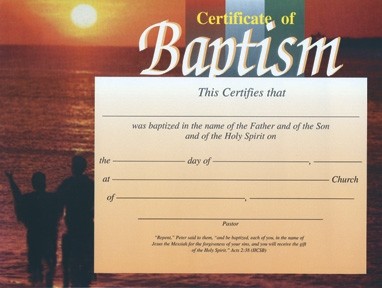 “A package of 6 flat certificates (8 1/2″ x 11″) for baptism printed on quality paper stock in 4-color. Space for name, date, church name and address, and pastor’s signature. The certificate features Romans 6:3-4 (KJV) Scripture. A free online template for this certificate is available at www.bhpublishinggroup.com.”