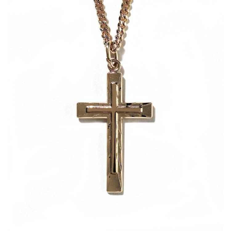 Etched design 1″” gold plated cross is topped with smaller cross for a beautiful dimensional look. Gold plated chain is 18″”. Deluxe gift box.