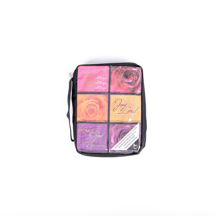 Rose photographs with clear Mylar pockets for inserting personal photographs. “Love believes all things, hopes all things, endures all things. The joy of the Lord is my strength. The peace of God surpasses all understanding.” Full color printed Bible Cover has a back outer pocket, inside handy pen loop, 3 ribbon bookmarks and a Christian fish zipper pull. 6 photo openings. Approximately 71/2″ x 10″ x 2″.