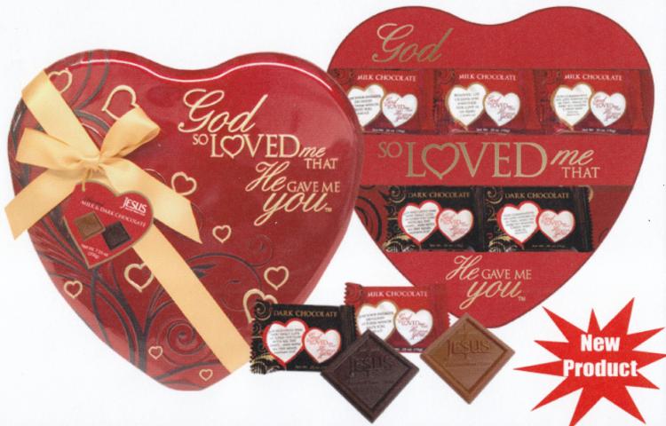 This beautifully embossed heart-shaped tin is filled with 20 smooth, rich chocolates and embellished with an elegant bow and hangtag. Assorted milk and dark chocolates are embossed with “Jesus Sweetest Name I Know” and individually wrapped in the “God So Loved Me That He Gave Me You” theme and a love scripture.