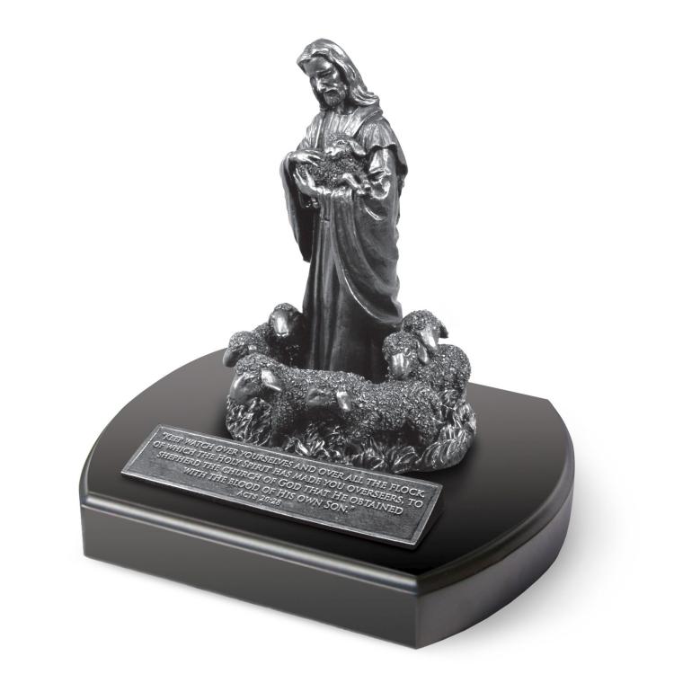 Our inspiring ministry version of the Good Shepherd sculpture powerfully portrays Jesus as our Good Shepherd. It features Acts 20:28. This timeless sculpture makes a perfect gift for any ministry servant. It is made with a silverlike finish and black satin MDF base. It is perfect for the home or office.