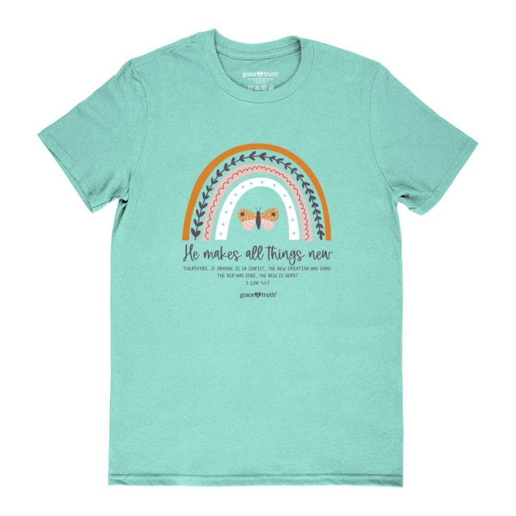 Celebrate your new self in Jesus name in this pretty All Things New T-Shirt in Celadon by grace & truth . God has made you a new creation. Out with the old you, in with the new. You ve been transformed by Jesus Christ!