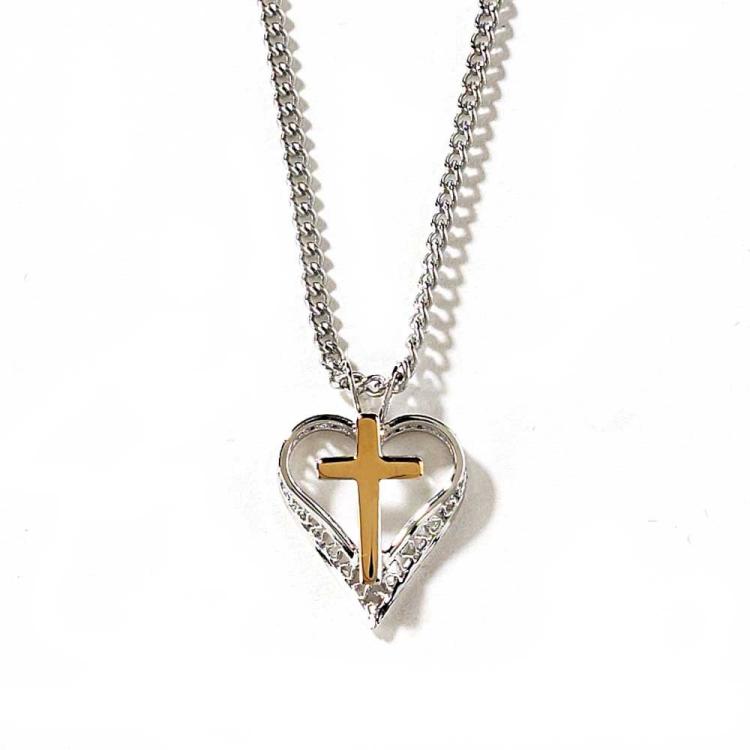 Silver filigree open heart beautifully frames a simple gold cross. Silver plated chain is 18″”; silver plated pendant is about 5/8″”. Deluxe gift box.