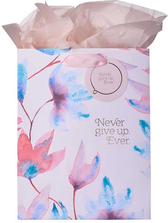 Uplift and inspire your best friend~ sister~ or roommate by packaging her gift in the Pink Petals Never Give Up Medium Gift Bag. Let this bag remind her that she is stronger than she knows.