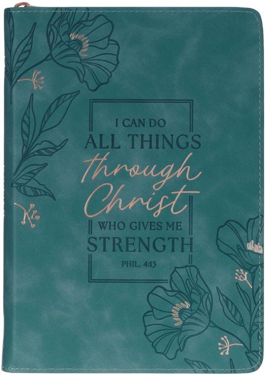 The Through Christ Teal Faux Leather Journal with Zippered Closure is a beautiful vessel for storing your daily reflections. Its zippered closure ensures the contents are safely protected and offers a small degree of privacy that will allow you to write with peace of mind.