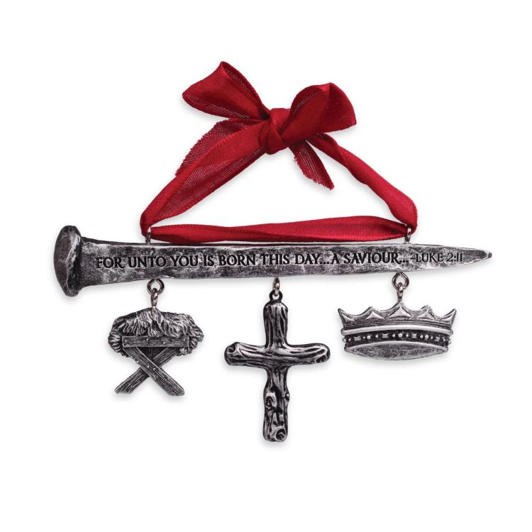 Features: Nail with three hanging charms: manger, cross, crown; ribbon to hang.