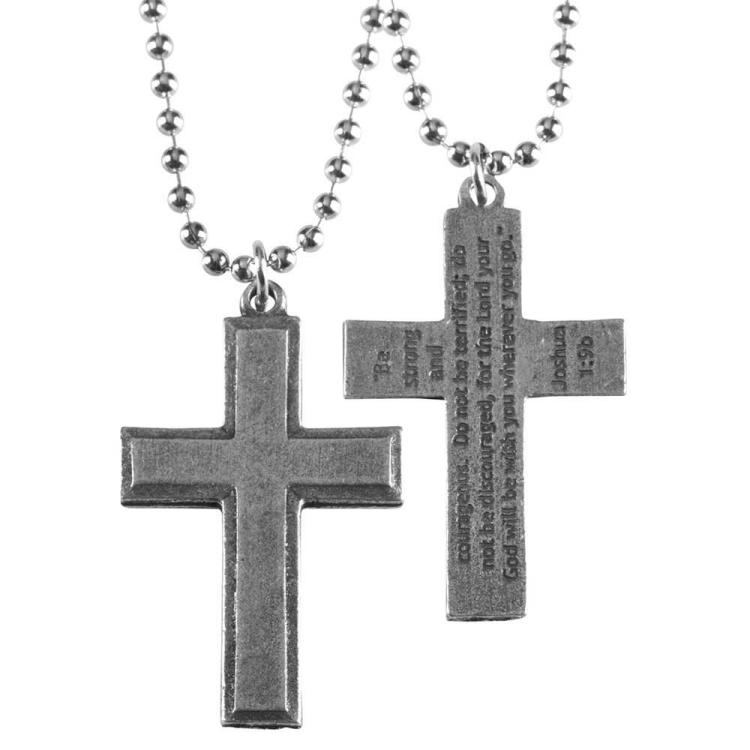 Pewter box cross has beveled edge on front; on back the verse Joshua 1:9 is engraved. “”Be strong and courageous. Do not be terrified; do not be discouraged, for the Lord your God will be with you wherever you go.”” Cross pendant is 1 5/16″” length on 21″” stainless steel ball chain. Necklace comes in a deluxe black gift box.
