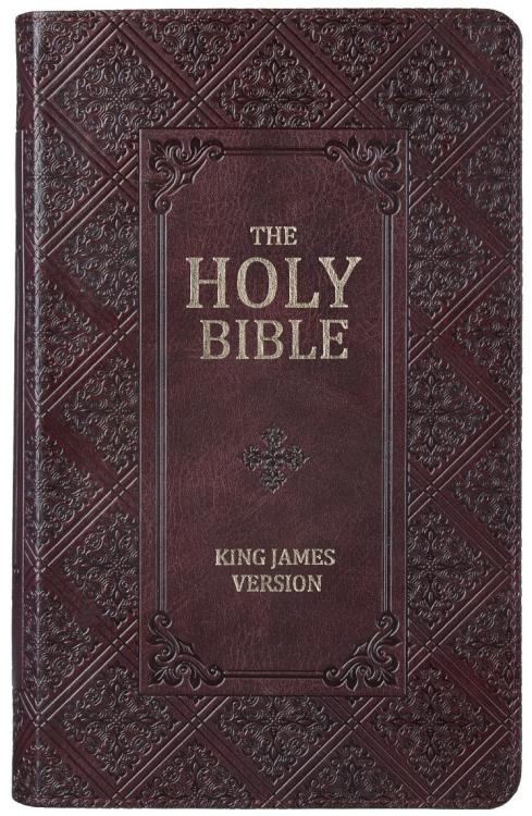 The exquisitely designed cover of the Dark Brown Faux Leather Giant Print Standard-size King James Version Bible with Thumb Index reflects the importance of its content.