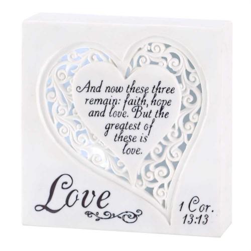 Faith, Hope, Love, 1 Cor.13:13 Resin- 4 3/4 inches Height – LED Light Batteries Included White Box w/Color Label