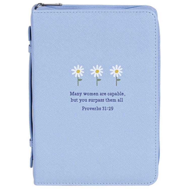This Periwinkle-Blue Bible Case Is Made From Polyurethane, In Hard-Shell Style. Has Lay-Flat Construction, With A Cross Zipper Pull. The Zipper Is Non-Rusting And Self-Repairing. This Cover Boasts Nylon Reinforced Stitching Plus A Side Carrying Handle. Inside Is An Elastic Pen Loop To Keep Your Pen Secure. The Front Has A Sweet Daisy Design With Proverbs 31:29: Many Women Are Capable, But You Surpass Them All. Large Size: 9-3/4 X 1-3/4 X 6-3/4.