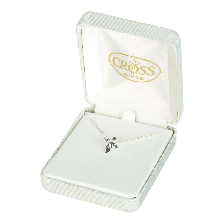 Mini Scalloped Petal Cross on 16 inch Chain Necklace in White Gift Box Attractive mini cross features pointed petal shapes that are scalloped out in front for a unique look. Silver plated pendant is 1/2 inch long; hidden bale on back holds the 16 inch silver plated chain. This necklace makes a wonderful gift for a girl of any age, or for women who prefer a shorter chain and small pendant. Comes in white fabric covered gift box with hinged lid.