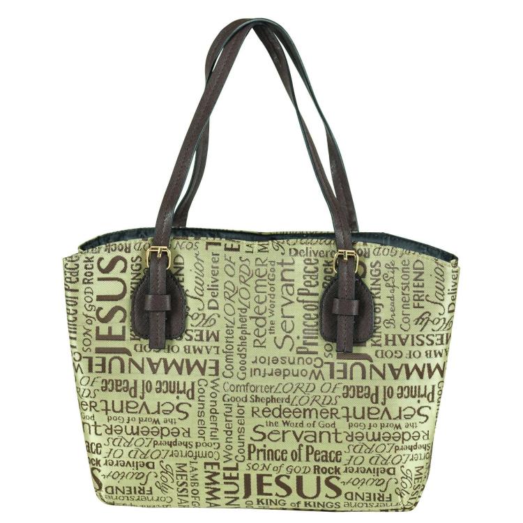 Biblical names of Jesus are embroidered jacquard style. Purse style handles, decorative buckles, Roomy outer pocket on each side closes with magnetic snap. Black taffeta lining throughout. Inside are attached pen loop and ribbon bookmark. Large size holds a Bible or book up to 9 3/4 x 6 3/4 x 1/3/4 inches.