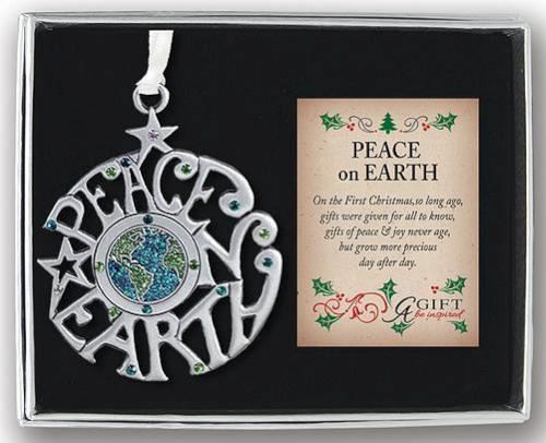 Hand-polished, bright finished metal ornament embellished with sparkling blue and green enamel and blue, green, and crystal stones. Hangs on white satin ribbon. Gift boxed with message card.