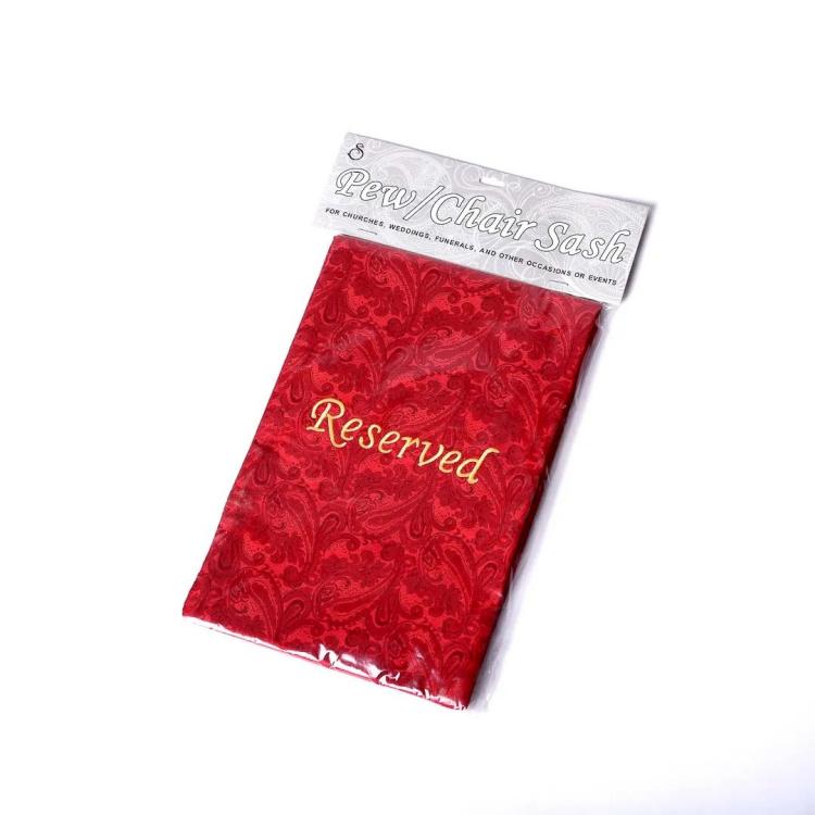Reserve pews or chairs the elegant way. Embroidered wording on both ends. Paisley jacquard fabric. Polyester; dry clean.
