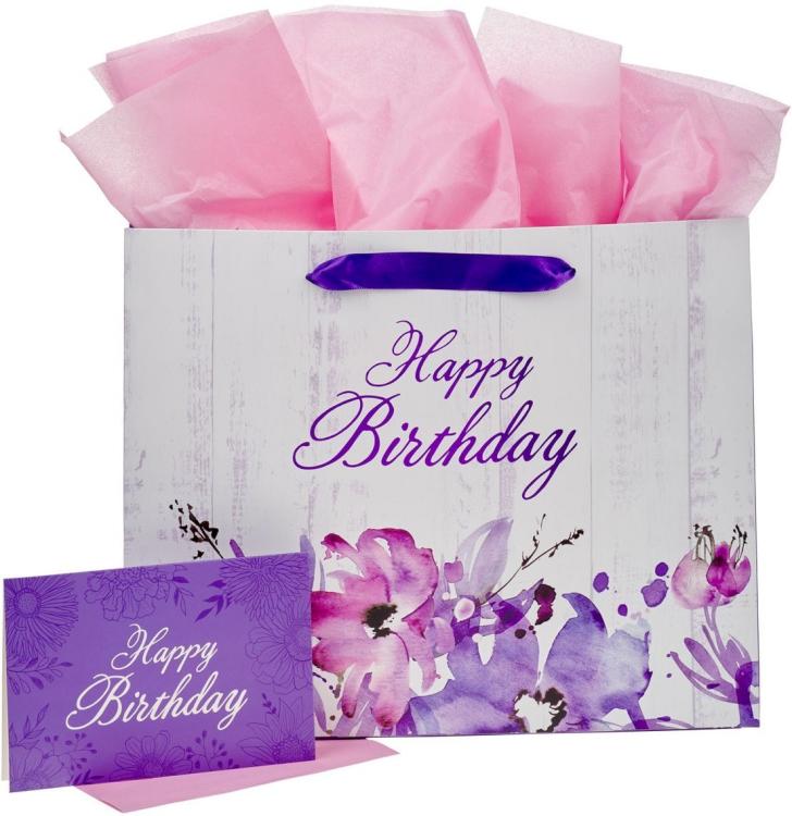 The pink and purple tones of the Happy Birthday Purple Floral Large Landscape Gift Bag and Card Set make it an ideal gift bag to hold a special gift for a girl or young lady on her birthday. This bag will safely hold anything from clothes to notebooks to electronics and more!