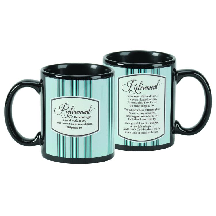 Retirement Philippians 1:6 Ceramic Mug 11 oz This ceramic coffee mug is a wonderful retirement gift. Front of mug has the words Retirement – He who began a good work in you will carry it on to completion Philippians 1:6. Back side has a poem. Mug is black ceramic with blue striped design. Holds about 11 ounces. Text of poem: Retirement elusive dream… For years I longed for you. So many plans I had for us; So many things to do. The sun now has a different glow While setting in the sky And fragrant roses call to me Each time I pass them by. How grateful am I for this gift A new life to begin… And I thank God that there will be More time to spend with Him. Poem by Janis Miner copyright Dicksons