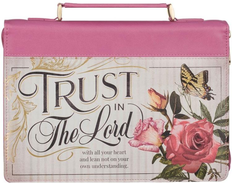 Release your fears when you heed the message of the Trust in the LORD Floral Begonia Pink Faux Leather Fashion Bible Cover. This fashion Bible cover~ with its comforting message and feminine design~ will protect your Bible from daily use.