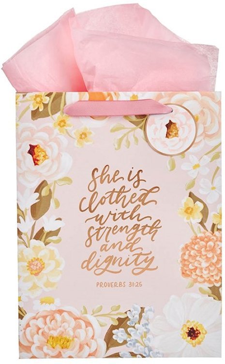 Elegant Pink Multicolored Floral Theme with Encouraging Scripture: The bag features a sentiment from beloved Scripture verse Proverbs 31:25 printed in a shiny, elegant rose gold foiled text: “She is clothed with strength and dignity”. The sentiment is featured on both sides of the bag within a stylish, white circular frame and encompassed by the beautiful, flower filled design.