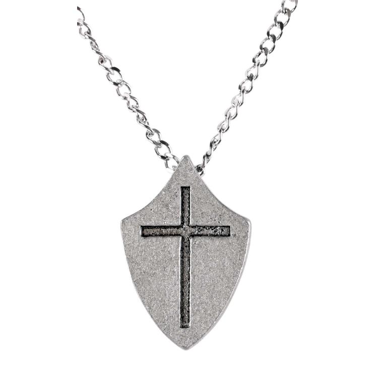 1 1/4 inches Shield Cross Necklace on 24 inch Stainless Steel Curb chain. Comes in black fabric covered deluxe gift box.