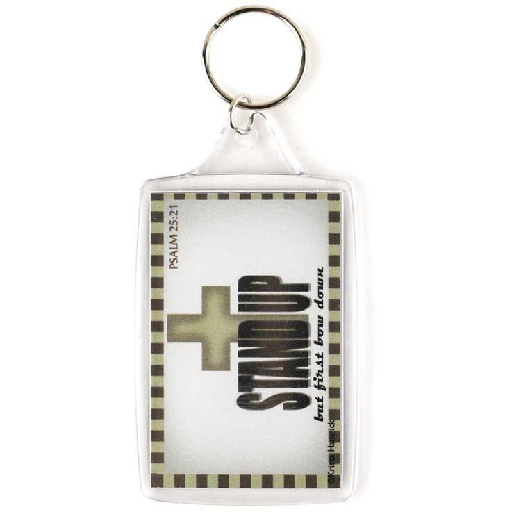 Keychain features a cross and Psalm 25:21: Stand up, but first bow down. 2-3/4 inches height. Copyright Krista Hamrick.