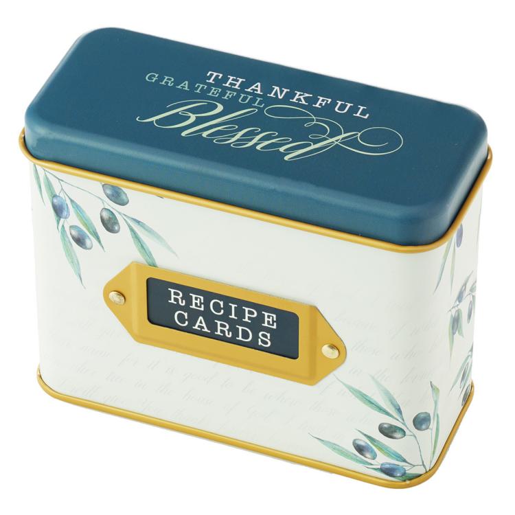 The Thankful, Grateful, Blessed Recipe Box With Cards comes with 50 cards for writing and sharing recipes with your mom, sister, best friend or others. The tin is beautifully decorated with an olive branch design.