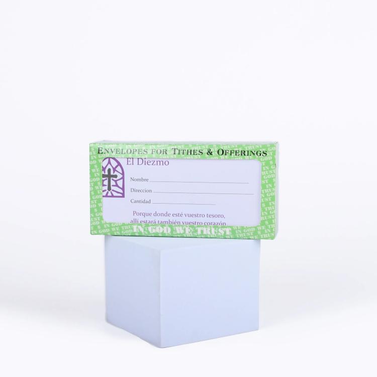 “El Diezmo – Porque donde este vuestro tesoro, alli estara tambien vuestro corazon. San Mateo 6:21.” Envelope has a place for name, address, and the amount enclosed. 3″ x 61/4″ with a sealable flap. 100 count.