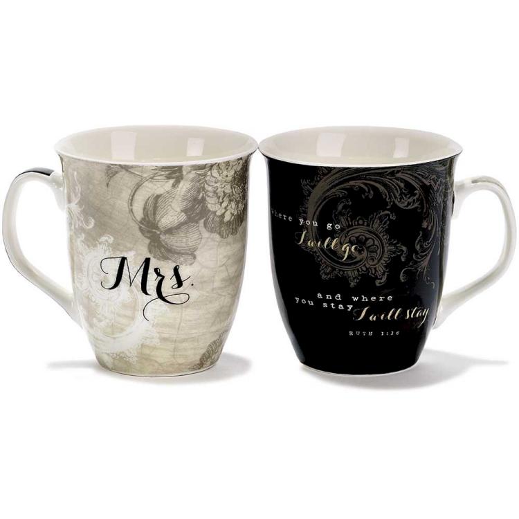 Gorgeous stoneware mug set is an excellent gift choice for wedding or bridal shower. There’s a black mug with gray and white design for the “”Mr””, and white mug with gray and black design for the “”Mrs””. Each mug holds 16 ounces. Beautifully boxed for gift giving. Mugs are microwave/dishwasher safe.
