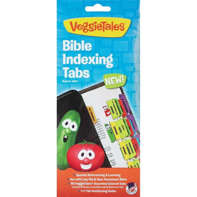 Colorful Bible tabs feature Bob & Larry, your favorite VeggieTales characters! Includes 90 vertical-style tabs in assorted colors, including 66 books and 24 reference tabs. Tab positioning guide included.