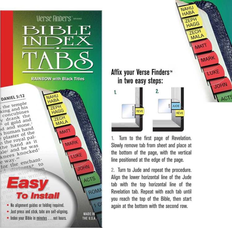 $5.99Features: Easy to install – no alignment guides or folding required. Just press and stick. Tabs are self-aligning. Index your Bible in minutes…not hours. Attractive and durable for years of trouble-free use. Horizontal style – reads left to right. Compact 3/8″ design indexes a standard Bible in only 2 rows, making books easier to find.