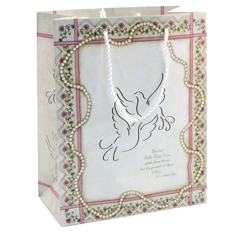 Lace, pearls, and a pair of doves embellish our glossy gift bag for the bride. Scripture quote But now Faith, Hope, Love, abide these three; but the greatest of these is love. I Corinthians 13:13 Pink and ivory with dove gift tag, glossy finish, soft white cord handle; includes three sheets of tissue to complete your gift wrapping in style!